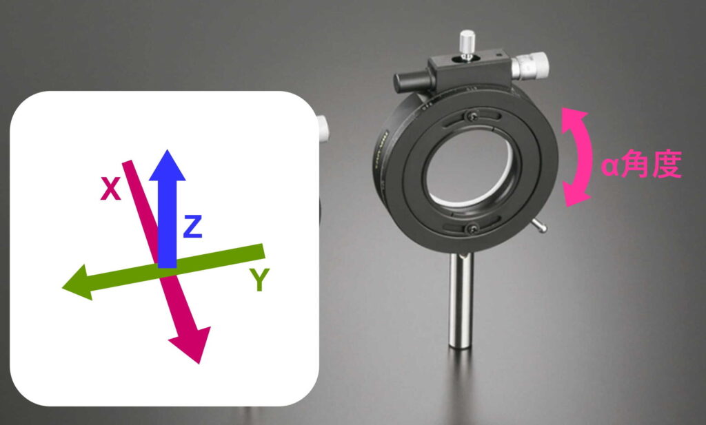 ・光軸に平行なX軸を中心とした回転(角度 α)につき、回転ツマミによる360°の粗動調整とマイクロメータヘッドによる±4~5°の微動調整が可能です。