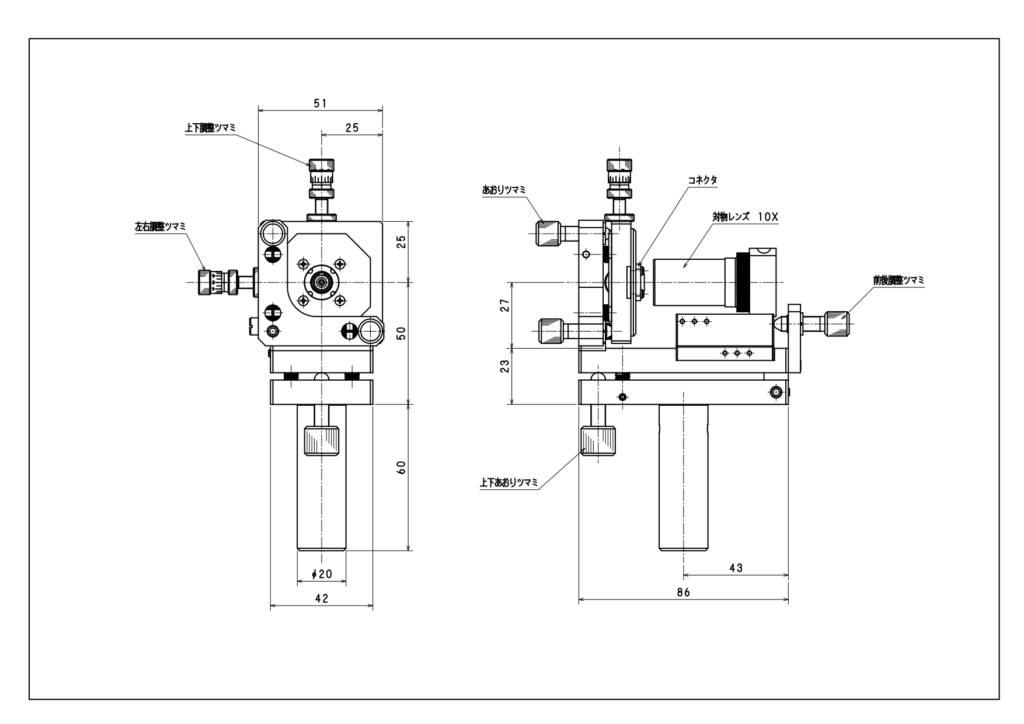 ・対物レンズ保持部は、光軸方向 (X軸) のフォーカス微動調整が可能です。