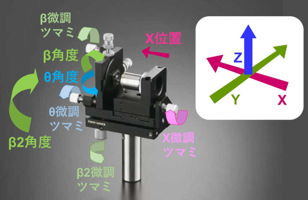 ・光ファイバ素子保持部は、キネマティック機構により支点を基準としたあおり角度(角度 βθ)の微動調整も可能です。上方のツマミがβ角度調整、下方のツマミがθ角度調整となります。