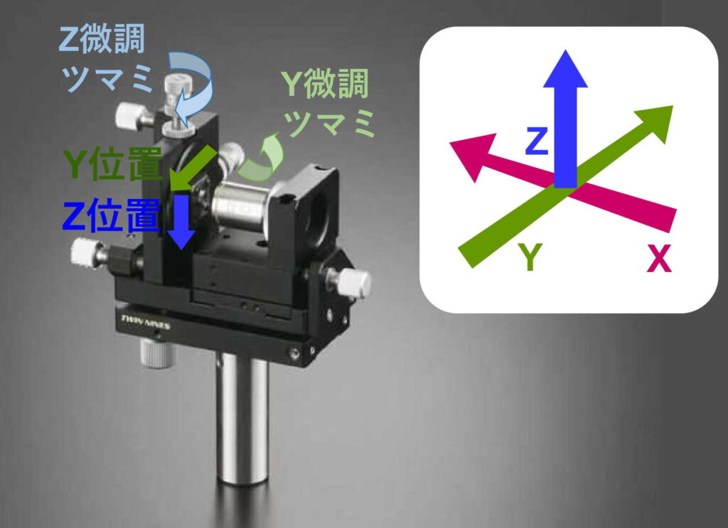 ・光ファイバ(レーザ光)の位置は、差動マイクロメータヘッドにより調整(芯出し調整(YZ軸調整))します。
