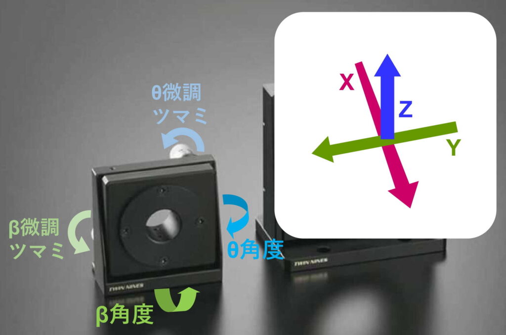 ・キネマティック機構により、支点を基準としたあおり角度(βθ角度)の微調整ができ、マイクロメータヘッドをツマミとして操作します。