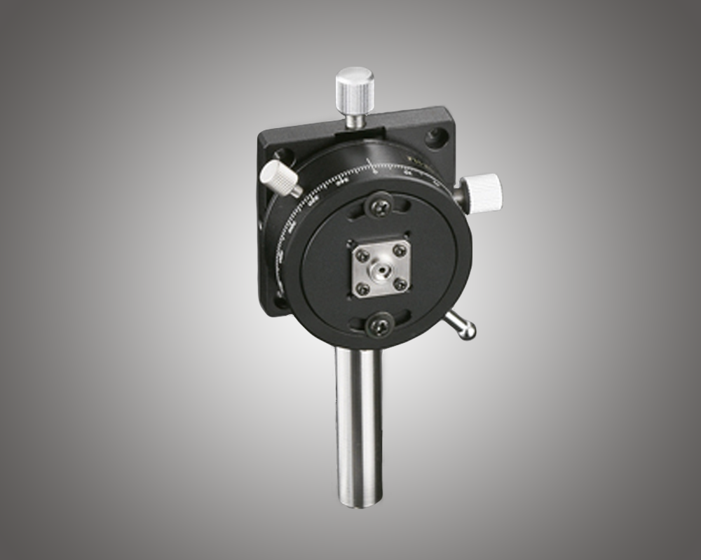・α角度の調整は、クランプ(円筒部品の左上)を緩めてから、回転ツマミ(円筒部品の右下)を使って、360°全周に粗動回転します。位置決め後、クランプを締めてα角度の回転を固定します。ホルダ側面の全周(360°)に付いた目盛( 1°刻み)により、調整角度を確認することができます。
