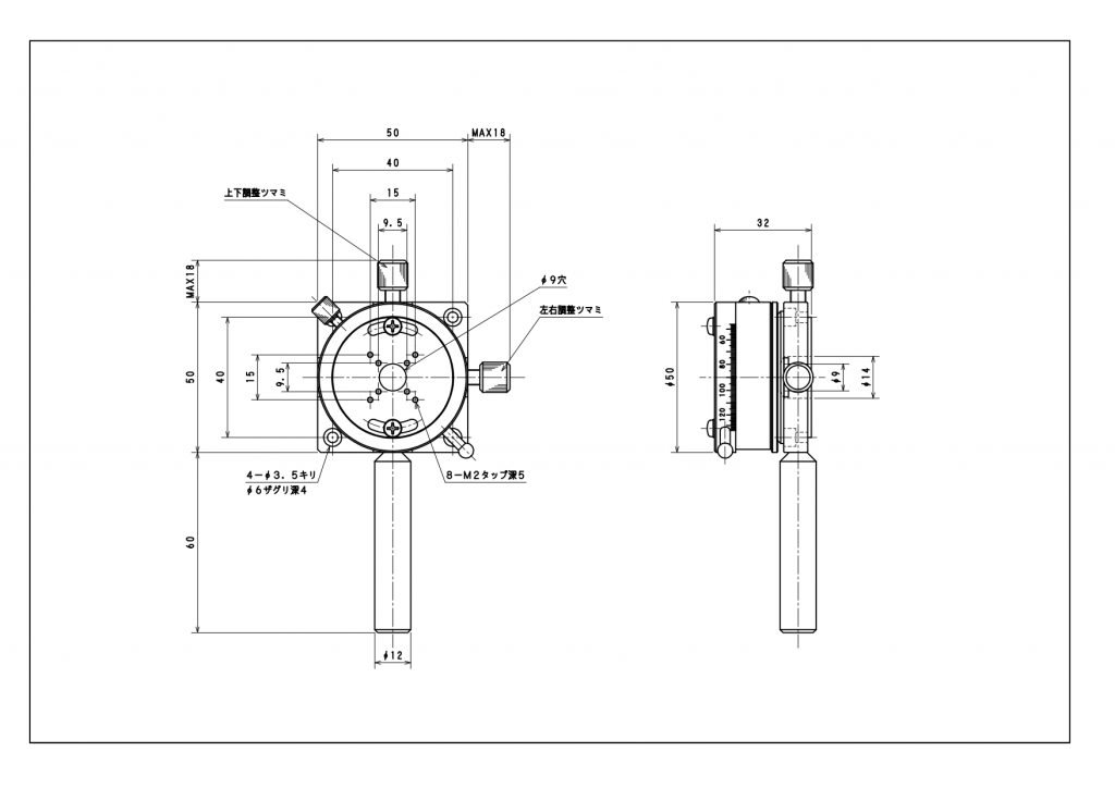 ・光軸に対し直交するYZ軸の芯出し調整が可能です。YZ軸の微動方式は、微調ネジタイプと差動マイクロメータヘッドタイプから選べます。
