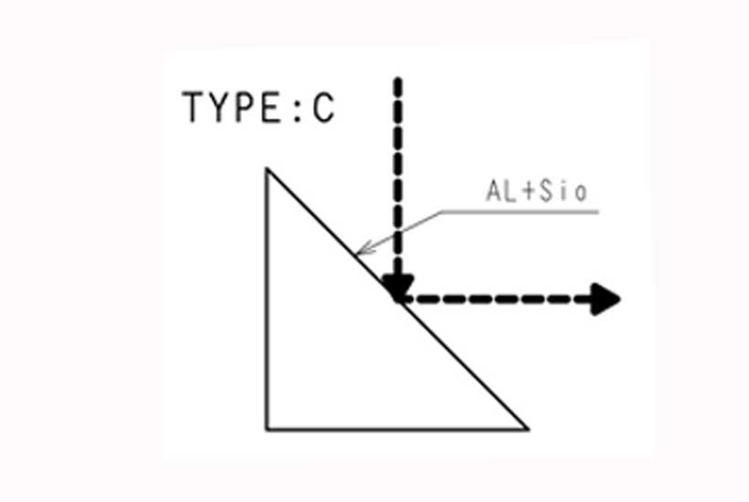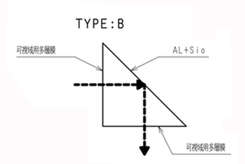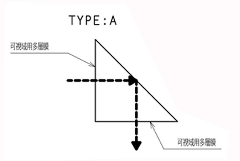 2面の反射防止膜の他に斜面に反射膜を施してあり垂直でない入射光に対しても反射効率を上げていきます。(Type-Aの斜面に反射膜を施したものです。)