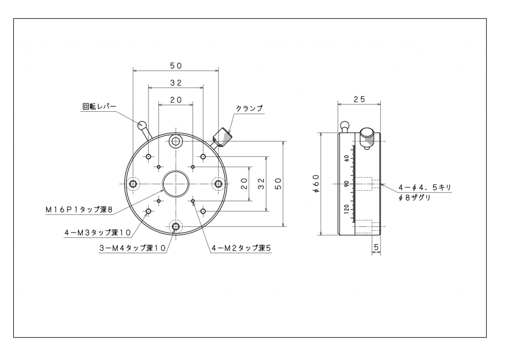 ・固定穴(底面):4-φ4.5キリ φ7.5ザグリ 深10 ステージ面 PCD50位置(M4キャップボルト用)
