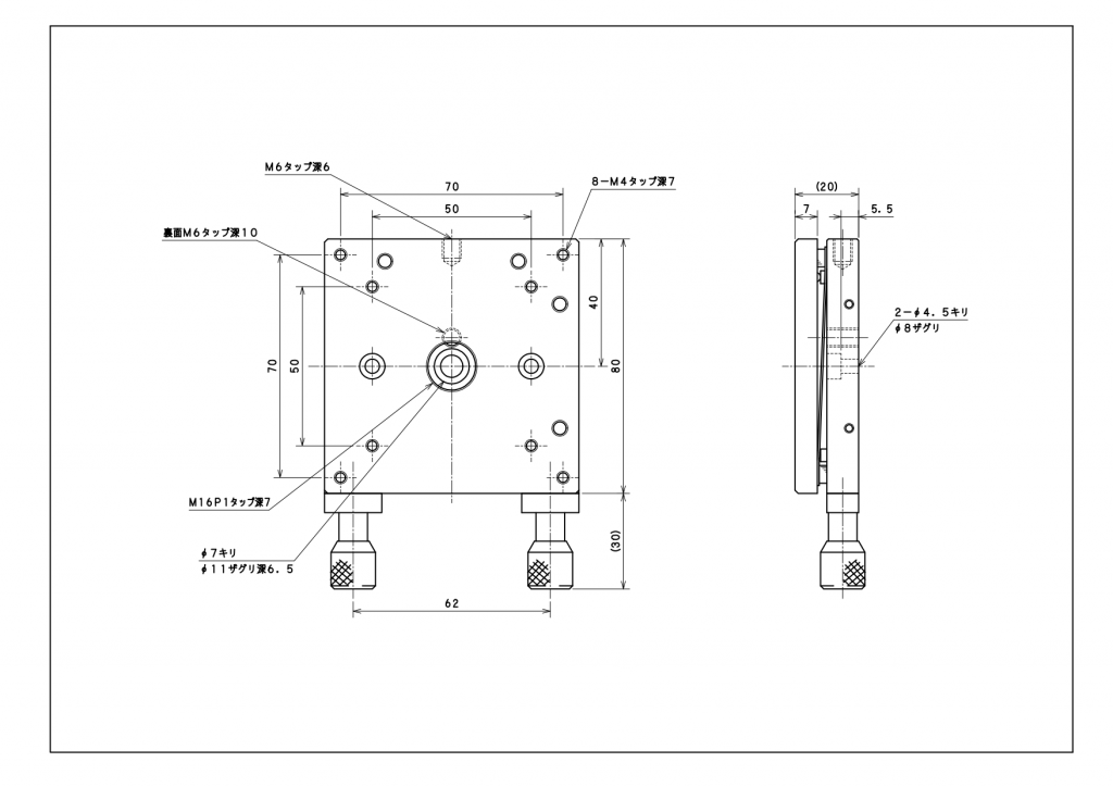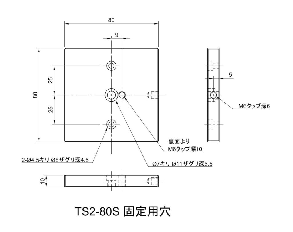 ・固定穴(底面):1-φ6.5キリ φ11ザグリ 5.8深 中央(M6キャップボルト用)、2-φ4.5キリ φ8ザグリ 4.5深 ピッチ50(M4キャップボルト用)