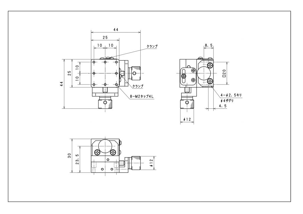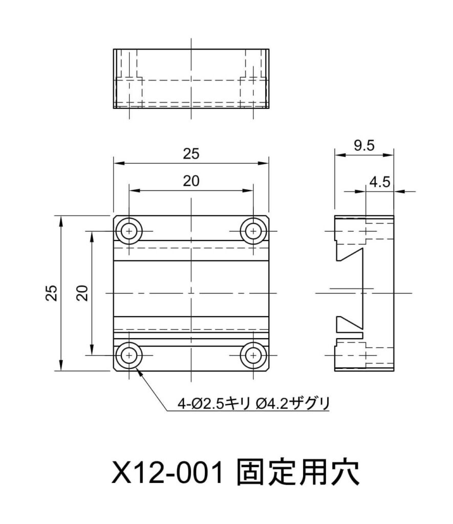 ・固定穴(底面):4-φ2.5キリ φ4.5ザグリ 深5 □20位置(M2キャップボルト用)