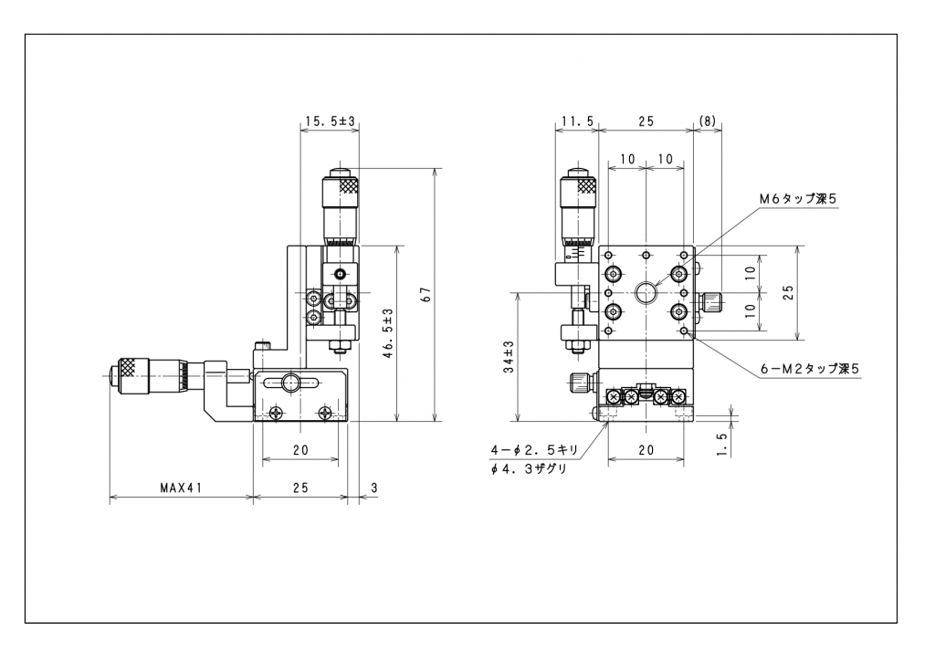 ・取付穴(ステージ面):1-M6 中央、6-M2 ピッチ10 □20位置
