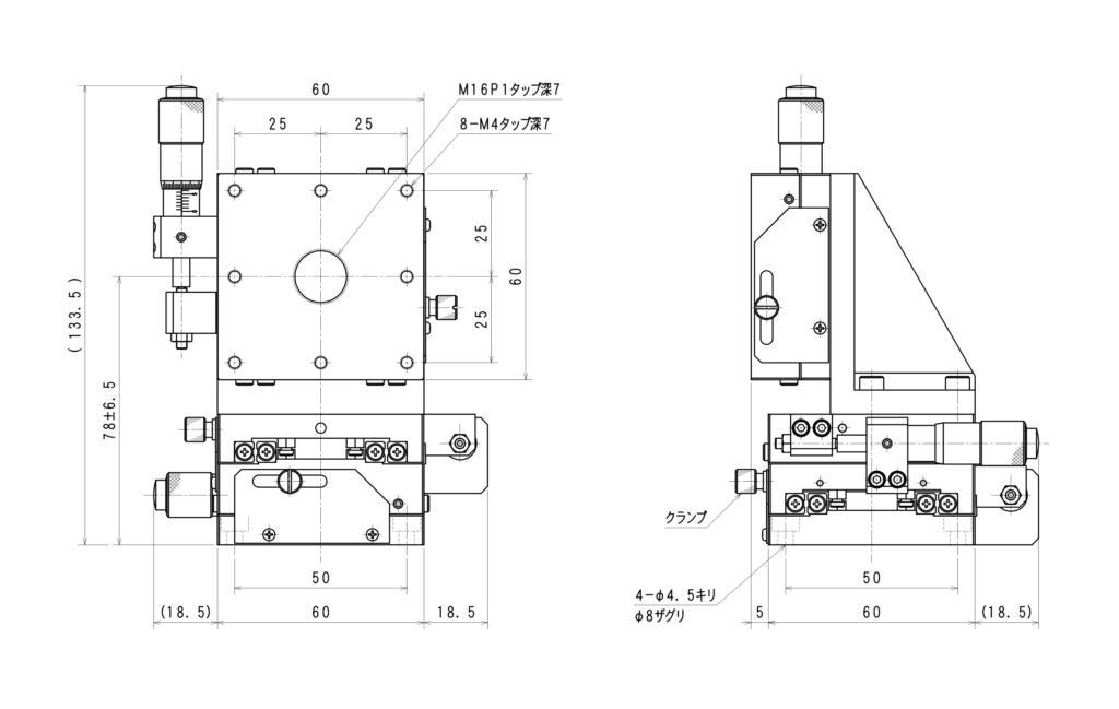 ・取付穴(ステージ面) :1-M16 P1 中央、8-M4 ピッチ25 □50位置