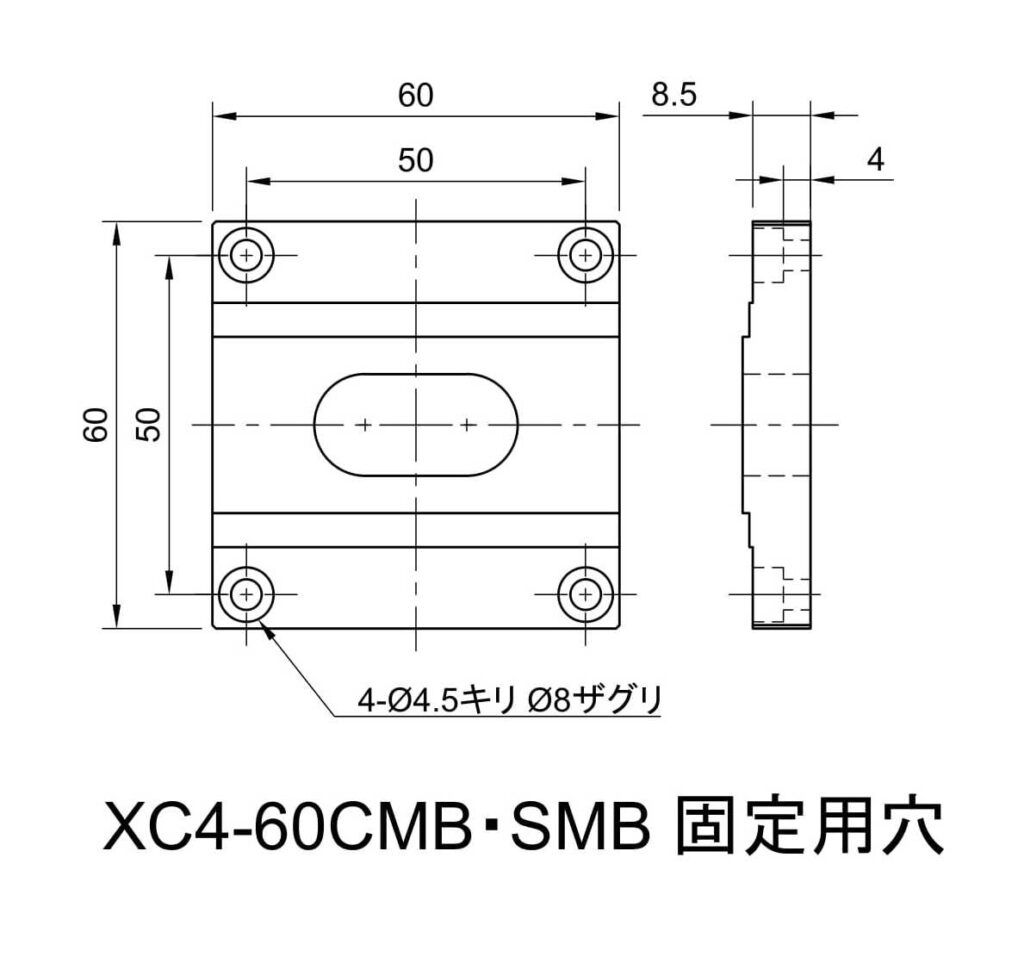 ・固定穴(底面)    :4-φ4.5キリ φ8ザグリ 深4.5 □50位置(M4キャップボルト用)