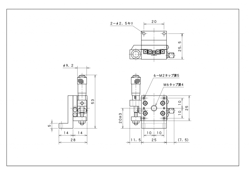 ・取付穴(ステージ面):1-M6 中央、6-M2 ピッチ10 □20位置